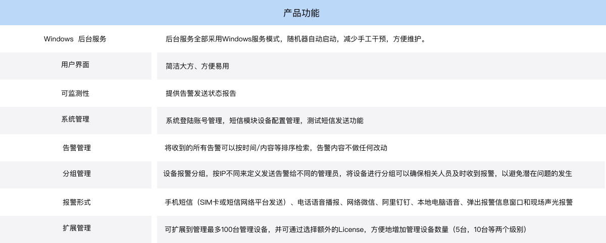 告警全面:提供手機短信(SIM卡發(fā)送)、手機短信(短信網絡平臺發(fā)送)、電話語音撥號、網絡微信、阿里釘釘、聲光報警、電腦語音、彈出信息窗口和手機APP等八大報警方式;